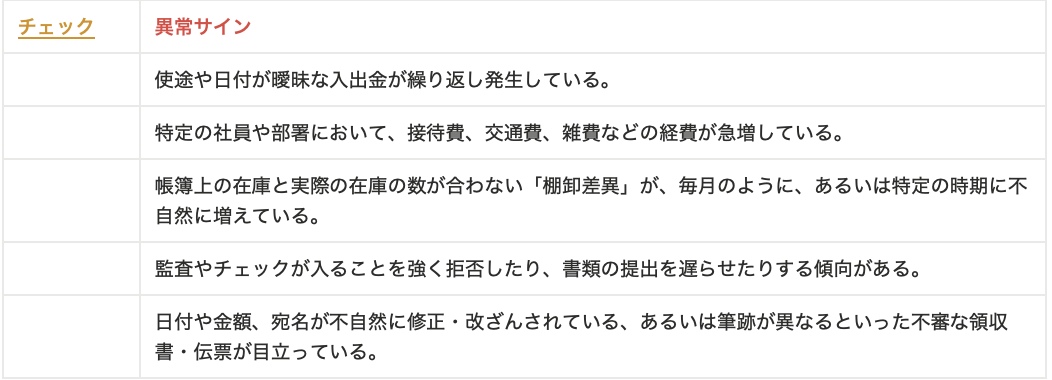 経営者や経理担当者は次の異常サインに特に注意を払ってください。