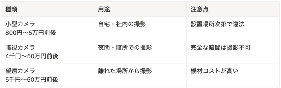夜間撮影には暗視カメラ、離れた場所からの撮影には望遠カメラが必要になるなど、目的に応じた機材選びも重要です。