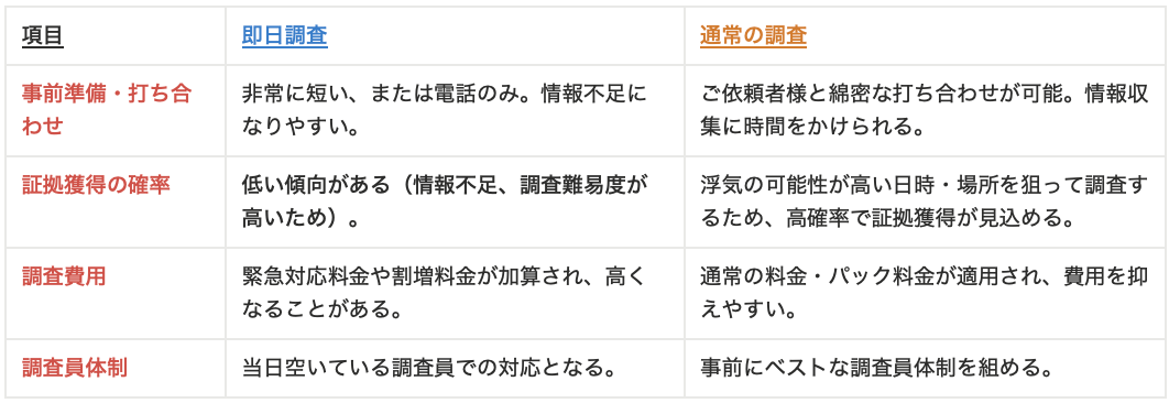 即日調査と、日程に余裕を持って依頼する通常の調査には、大きな違いとリスクの差があります。
