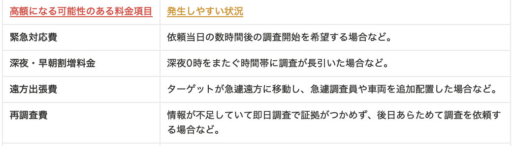 以上の状況の場合は、こういった追加費用が発生しやすい傾向があるため、即日調査を検討している方は理解しておきましょう。