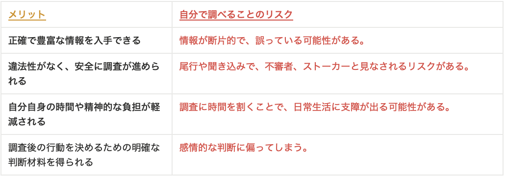 探偵に素行調査を依頼するメリットは、ご自身で調べる場合と比較して非常に大きいです。