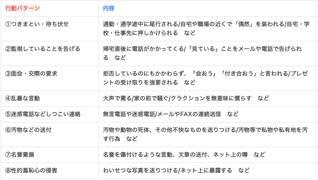 出典:福島県警察本部「ストーカー行為とは?つきまとい等の8つのパターン」