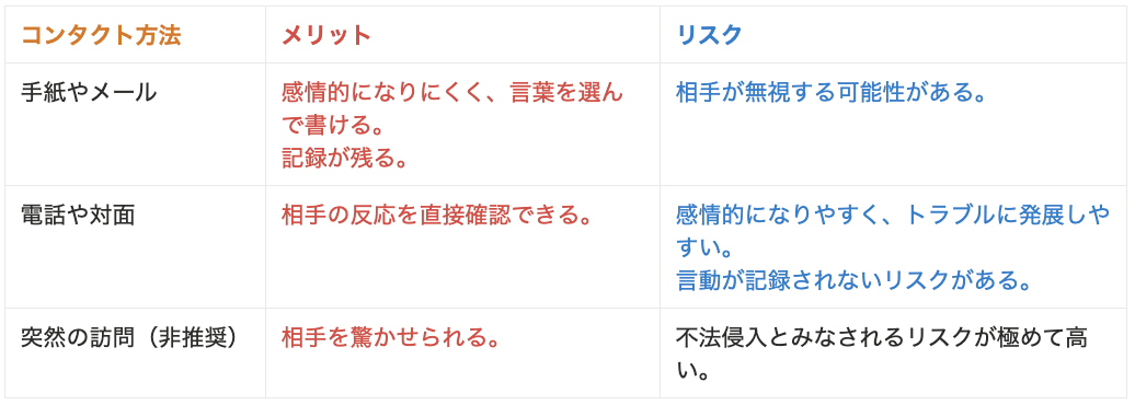 不適切な方法での接触は、名誉毀損や脅迫とみなされる可能性がありますので、感情的にならずに、相手の反応に柔軟に対応することを心がけましょう。